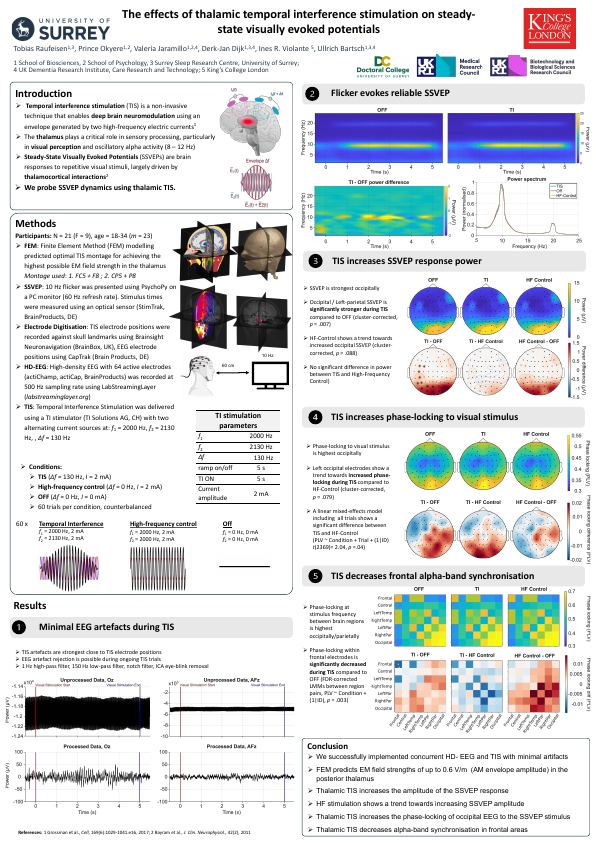 Prince uses Temporal Interference Stimulation (TIS) – a non-invasive brain stimulation technique capable of targeting deep brain structures like the hippocampus. He combines TIS with high-density EEG and behavioural measures to examine hippocampal-cortical dialogue during sleep.