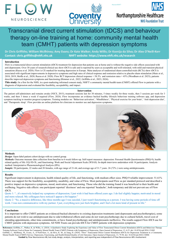 ‘Flow’ transcranial direct current stimulation (tDCS) device and behaviour therapy training software used at home for community mental health team (CMHT) patients with symptoms of depression